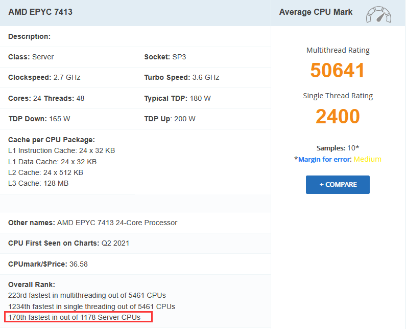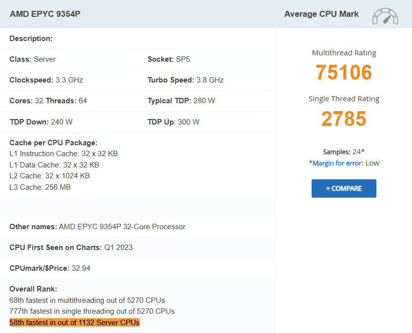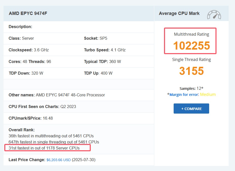 AMD EPYC 9474F 处理器的多线程处理能力比 Rocket.net (非常昂贵,号称最快的WordPress主机)使用的AMD EPYC 7413 处理器(配合 DDR5 内存与 PCIe 5.0 NVMe 固态硬盘)高出 200%。